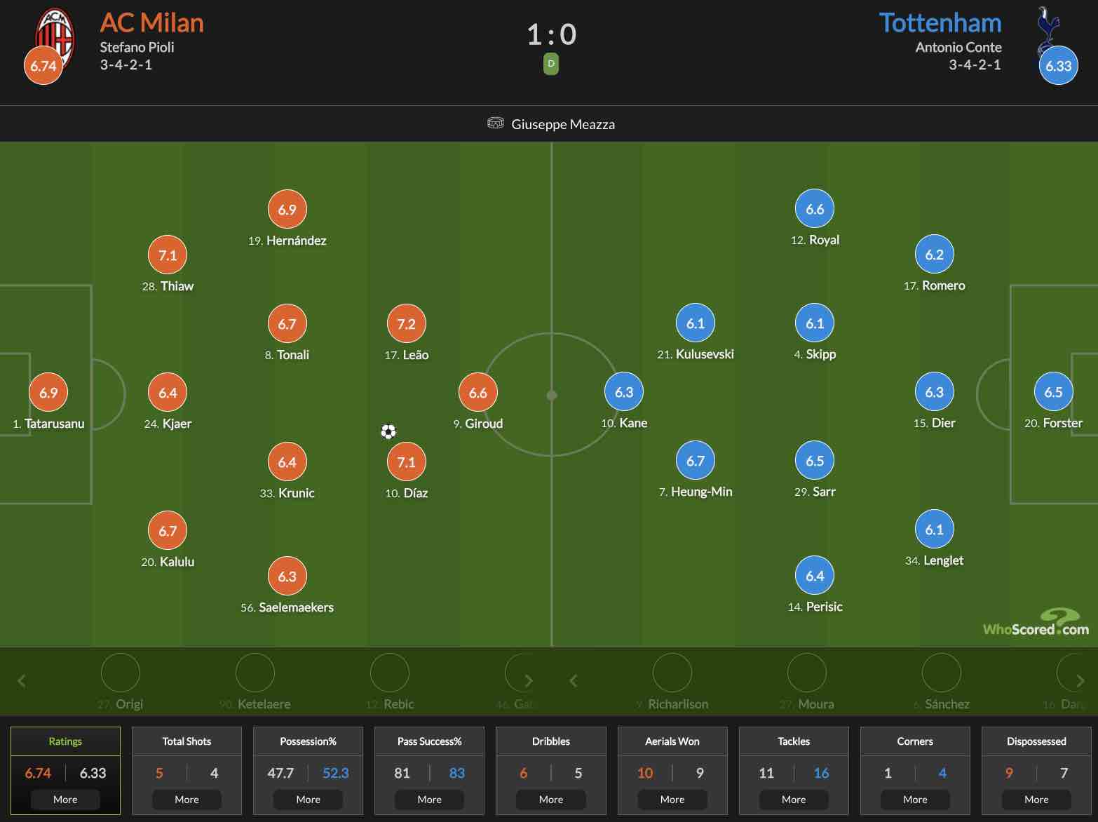 "მილანი" 1:0 "ტოტენჰემი" | ფეხბურთელთა შეფასებები მატჩის პირველ ნახევარში